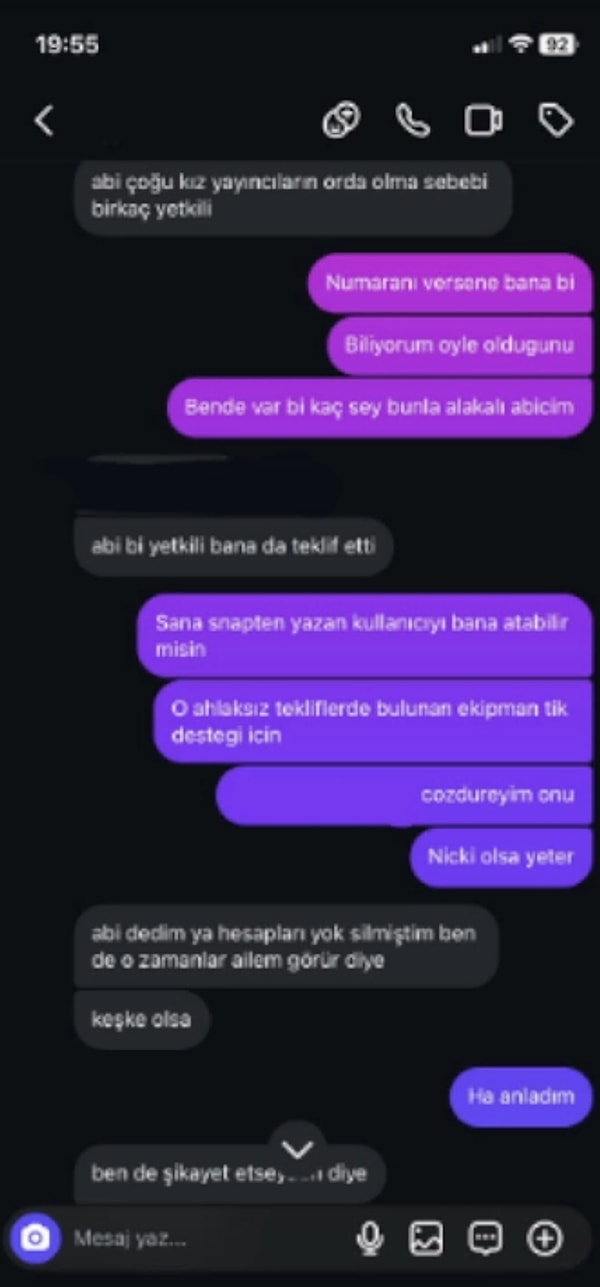Sonrasında ise Kick yetkisi olan Tarık isimli biriyle irtibata geçtiğini, akabinde Tarık’ın, ‘Instagram çok ağır, Snapchat’ten konuşalım’ diyerek kendisine Snapchat’te ahlaksız tekliflerde bulunduğunu argüman etti.