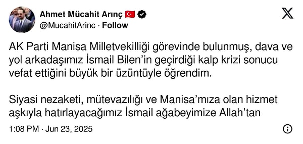 AKP Manisa Milletvekili Ahmet Mücahit Arınç’ın paylaşımı