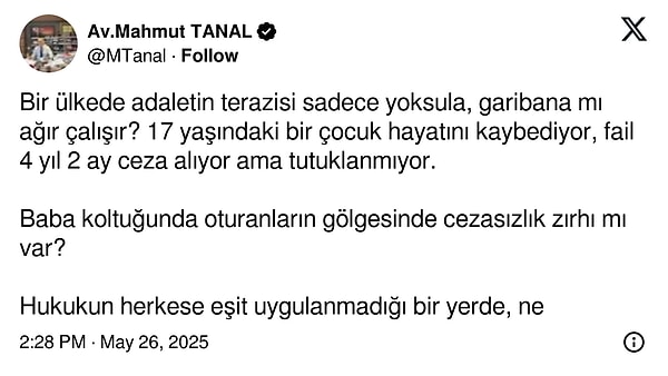 ‘Bir ülkede adaletin terazisi yalnızca fakire, garibana mı ağır çalışır? 17 yaşındaki bir çocuk hayatını kaybediyor, fail 4 yıl 2 ay ceza alıyor lakin tutuklanmıyor.