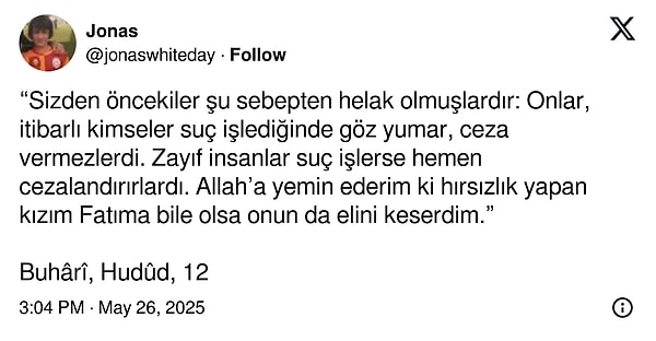 “Sizden evvelkiler şu sebepten helak olmuşlardır: Onlar, prestijli kimseler kabahat işlediğinde göz yumar, ceza vermezlerdi. Zayıf beşerler hata işlerse çabucak cezalandırırlardı. Allah’a yemin ederim ki hırsızlık yapan kızım Fatıma bile olsa onun da elini keserdim.”