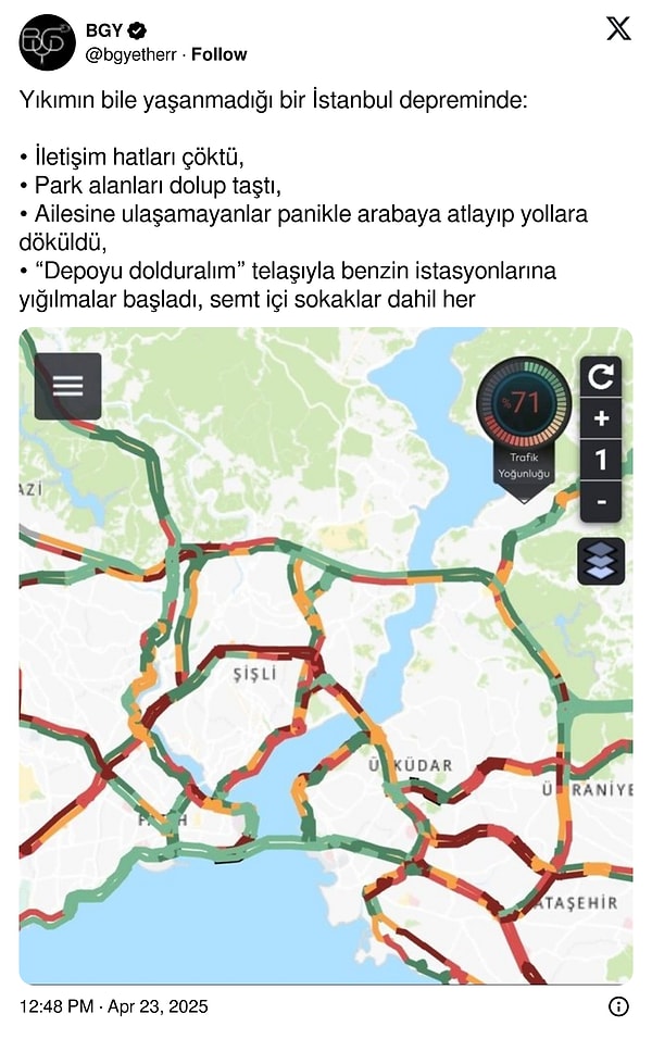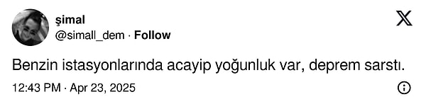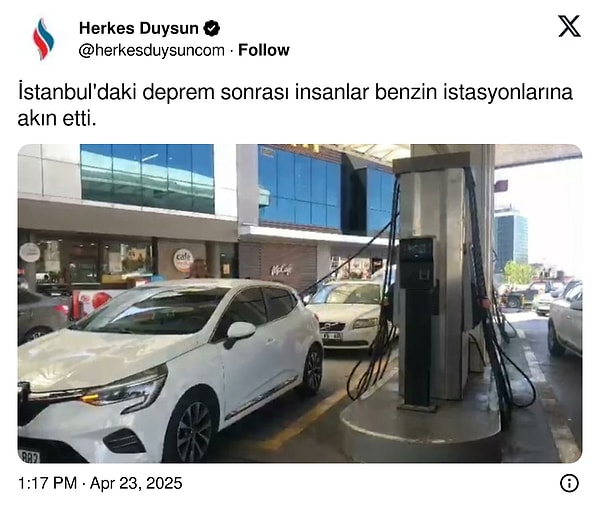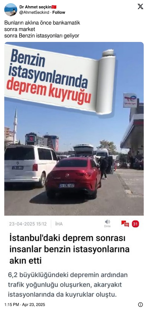 23 Nisan’da İstanbul’da peş peşe sarsıntılar meydana geldi. İlk olarak 3.9 daha sonra 6.2 büyüklüğünde yaşanan depremlerin akabinde artçılar devam etti. Halkı paniğe sürükleyen zelzelelerin akabinde sokağa dökülen halk araçlarına akın etti. Trafik yoğunluğunun yüzde 76’ya yükseldiği İstanbul’da benzinliklerde uzun kuyruklar oluştu!