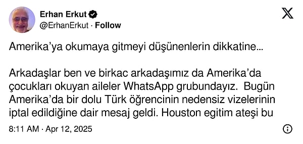 Akademisyen Prof. Dr. Erhan Erkut, WhatsApp kümelerinden gelen bir iletisi paylaştı: “ABD’de 60 Türk öğrencinin vizesi iptal edildi.”