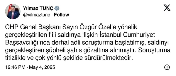 “CHP Genel Lideri Sayın Özgür Özel’e yönelik gerçekleştirilen fiili taarruza ait İstanbul Cumhuriyet Başsavcılığı’nca derhal isimli soruşturma başlatılmış, saldırıyı gerçekleştiren kuşkulu şahıs gözaltına alınmıştır. Soruşturma titizlikle ve çok taraflı biçimde sürdürülmektedir.