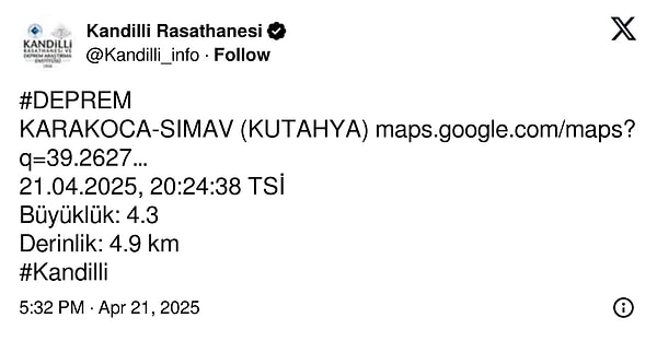 AFAD, Kütahya’nın Simav ilçesinde yaşanan sarsıntıyla ilgili paylaşımda bulundu.