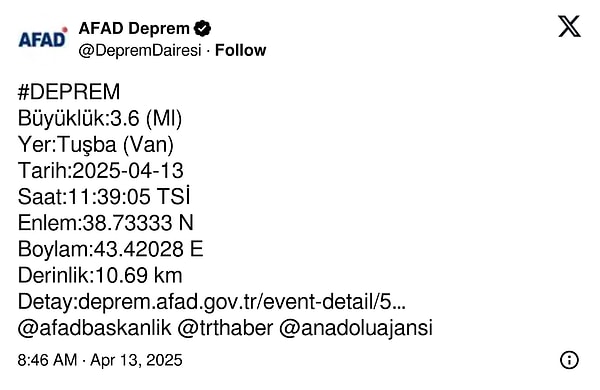 AFAD bu sabah saatlerinde Van’da yaşanan zelzeleleri paylaştı.