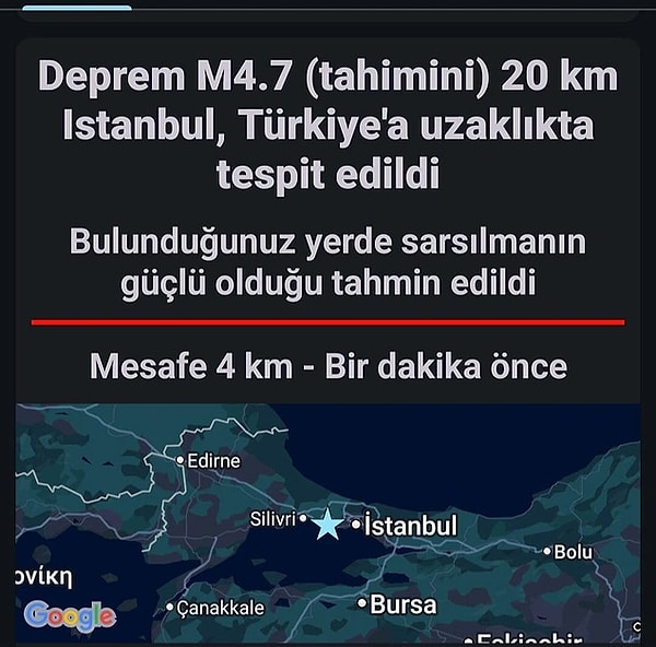 Dün gece saatlerinde Marmara Denizi’nde Büyükçekmece açıklarında yaşanan 3.5 büyüklüğündeki zelzele nedeniyle kimi vatandaşların telefonlarına kusurlu zelzele bildirimi gelmişti.