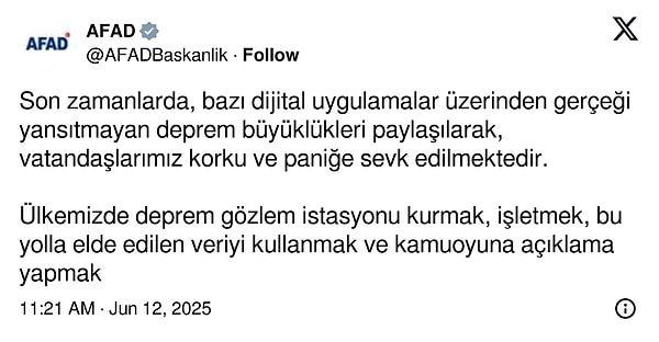 AFAD, toplumsal medya hesabından yaptığı açıklamada zelzele bildirim uygulamalarına reaksiyon gösterdi.