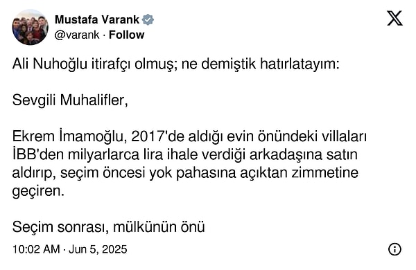 AKP Bursa Milletvekili Mustafa Varanks toplumsal medya hesabından Ekrem İmamoğlu ile ilgili paylaşımda bulundu.