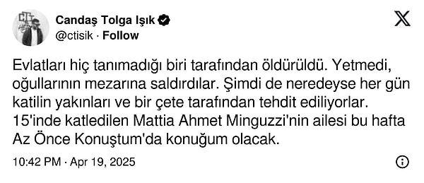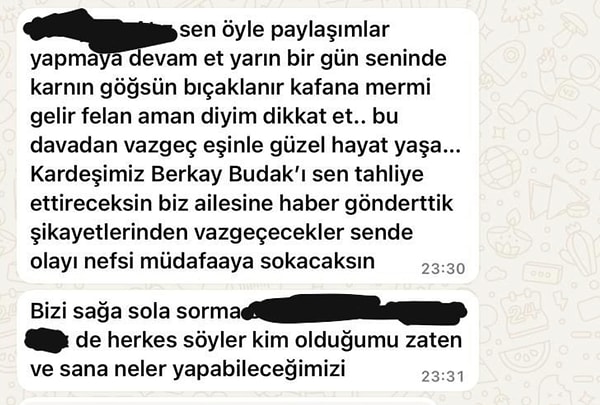Bu dün gece yayınlanan ve Yasemin Minguzzi ile birikte katıldığımız ‘Az Evvel Konuştum ‘ isimli programdan sonra ben ve eşimin telefonuna gelen iletiler. İlgilisi ve kümenin ismi gerçek dışı bir halde kullanılmış olabileceğinden hukuken üstünü çizdim. Sonrasında ben ve eşim imajlı olarak da arandık. Mevzuyu Başsavcılık ve Emniyete de aktardım. Valilik makamına da gerekli tedbirlerin alınması icin müracaatta bulundum. Umarım gerekenler yapılır. Hukuken de sonuna kadar takipçisi olacağım. Bu tehditler ve baskılar bizi yıldıramaz ve korkutamaz. Ahmet Minguzzi’nin katillerinin emsal mahiyette cezalandırılması için türel gayretimiz sonuna kadar sürecektir.