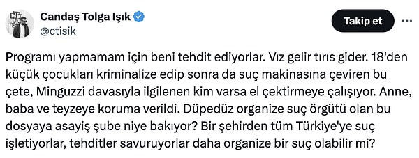 Candaş Tolga Işık programı bu türlü duyurmuştu. Akabinde tehdit bildirileri aldı.
