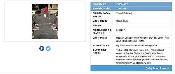 Güvensizlik nedeni ise şöyle gösterildi: ‘Ts En 14682 Standardı Kısım 3.2.1: ‘Küçük çocuk hedefi ile giysiler şapka, üst göğüs yahut boyun bölgesinde büzme ipi, işlevsel kordonlar yahut dekoratif kordon içerecek halde tasarlanmamalıdır, üretilmemelidir’ unsuruna aykırılık’