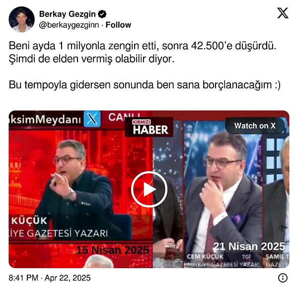 Cem Küçük’ün açıklamalarının yer aldığı bir vidoyu paylaşan Berkay Gezgin, “Bu tempoyla gidersen sonunda ben sana borçlanacağım.” tabirlerini kullandı.