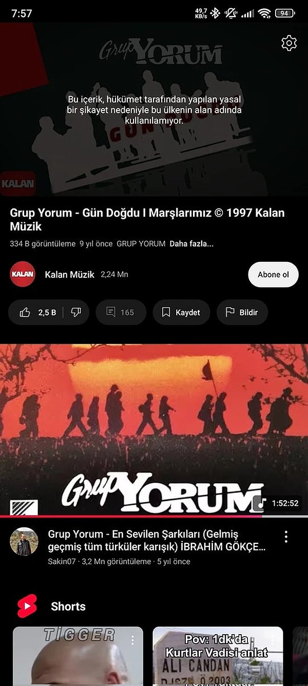 Gruba ilişkin 2 kanal engellendi, kişisel olarak paylaşılan görüntülere da ulaşılamıyor. Küme Yorum’a ilişkin “halklarınsesiyiz” ve “grupyorumtv” isimli kanallar kapatılırken, Kalan Müzik tarafından paylaşılan müziklere da erişim engeli getirildi. YouTube erişim pürüzüne sebep olarak, “Bu içerik, hükümet tarafından yapılan yasal bir şikayet nedeniyle bu ülkenin alan isminde kullanılmıyor” açıklaması yaptı.