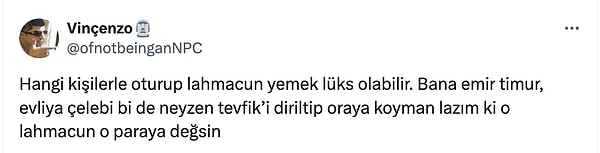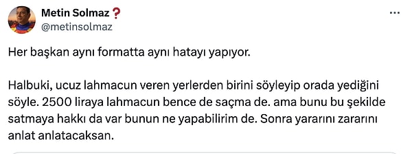 2 bin 500 liraya lahmacun bir iki yer hariç, ki oraya da gitmek sizin tercihiniz, siz orada lahmacunu satın almıyorsunuz, orada o şahıslarla oturma hürriyete, o çatal bıçağı kullanma hürriyeti, o görüntüde o lüksü yaşama hürriyetini satın alıyorsunuz.”