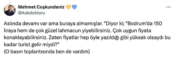 Dünyanın güneşi, denizi, tarihi, kültürü ve gastronomisiyle kabul gören bu hazine kentinin, Anadolu kültürünün lezzetlerinden ‘lahmacun’ ve lahmacun fiyatlarıyla anılması bizim olduğu kadar, memleketin de kalbini kıran bir demodelik içeriyor. Bodrum’da, lahmacun da elbette sevilen tatlarımızdan biri olacak lakin Bodrum asla lahmacundan ibaret olmayacaktır.”