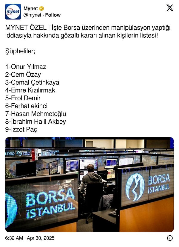 İstanbul Cumhuriyet Başsavcılığı’nca Borsa İstanbul’da manipülatif hareketler yaptıkları tespit edilen 15 kuşkulu hakkında ‘suç işlemek emeliyle örgüt kurmak’ ve ‘piyasa dolandırıcılığı’ hatalarından gözaltı kararı verildi.