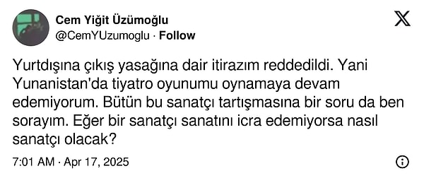 ‘Yurt dışına çıkış yasağına dair itirazım reddedildi. Yani Yunanistan’da tiyatro oyunumu oynamaya devam edemiyorum. Bütün bu sanatçı tartışmasına bir soru da ben sorayım. Şayet bir sanatçı sanatını icra edemiyorsa nasıl sanatçı olacak?’