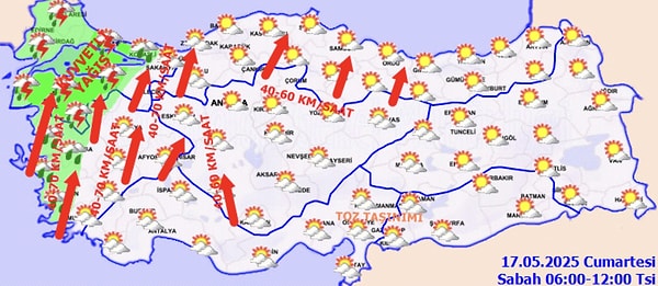 Meteoroloji Genel Müdürlüğü tarafından yapılan açıklamaya nazaran ülke geneli 17 Mayıs Cumartesi günü modüllü ve çok bulutlu olacak. Marmara, Kıyı Ege, Batı Karadeniz, Manisa, Kütahya, Karaman, Niğde, Ordu, Giresun ve Tokat etrafları ile Antalya’nın doğu ilçeleri; Doğu Akdeniz’in Toroslor mevkii sağanak ve gök gürültülü sağanak yağışlı geçecek.