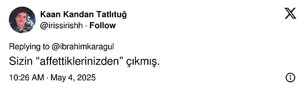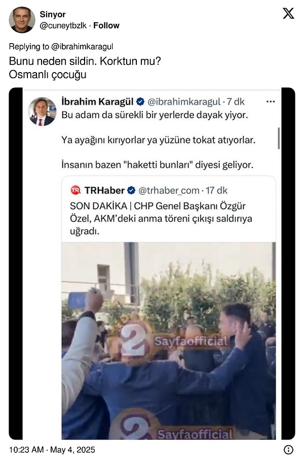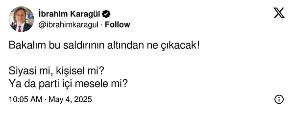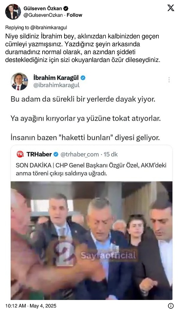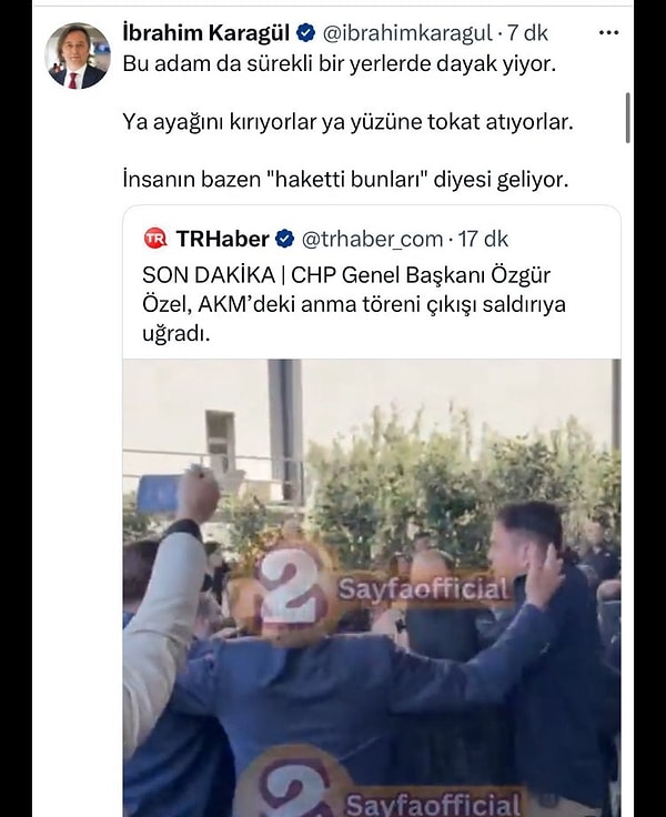 Karagül paylaşımında “Bu adam da daima bir yerlerde dayak yiyor. Ya ayağını kırıyorlar ya yüzüne tokat atıyorlar. İnsan bazen “haketti bunları” diyesi geliyor” tabirlerini kullandı.