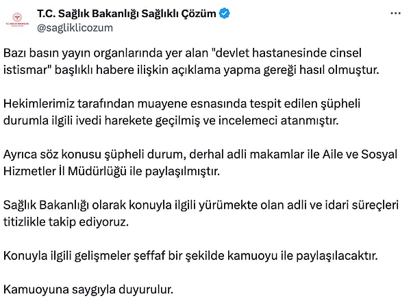 Bakanlık tarafından yapılan açıklamada şu tabirler kullanıldı: ‘Bazı basın yayın organlarında yer alan ‘devlet hastanesinde cinsel istismar’ başlıklı habere ait açıklama yapma gereği hasıl olmuştur. Doktorlarımız tarafından muayene esnasında tespit edilen kuşkulu durumla ilgili acele harekete geçilmiş ve incelemeci atanmıştır. Ayrıyeten kelam konusu kuşkulu durum, derhal isimli makamlar ile Aile ve Sosyal Hizmetler İl Müdürlüğü ile paylaşılmıştır. Sağlık Bakanlığı olarak konuyla ilgili yürümekte olan isimli ve idari süreçleri titizlikle takip ediyoruz. Hususla ilgili gelişmeler şeffaf bir halde kamuoyu ile paylaşılacaktır. Kamuoyuna hürmetle duyurulur.”
