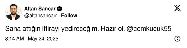 ‘Sana attığın iftirayı yedireceğim. Hazır ol’ kelamlarıyla Cem Küçük’ü etiketleyen Altan Sancar, ‘Alışmışsın parasını almadığın kelamı edememeye. Herkesi kendin üzere sanıyorsun. Ben seni bu kadar korkuttuysam ne keyifli. Ancak asıl artık başlıyorum’ dedi ve şöyle devam etti: