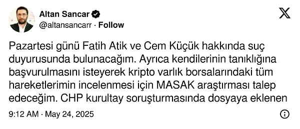 ‘Pazartesi günü Fatih Atik ve Cem Küçük hakkında cürüm duyurusunda bulunacağım. Ayrıyeten kendilerinin tanıklığına başvurulmasını isteyerek kripto varlık borsalarındaki tüm hareketlerimin incelenmesi için MASAK araştırması talep edeceğim. CHP kurultay soruşturmasında evraka eklenen MASAK raporunun da evraka eklenmesini isteyeceğim. Haydi bakalım, kimin saklayacak neyi varmış görelim.’