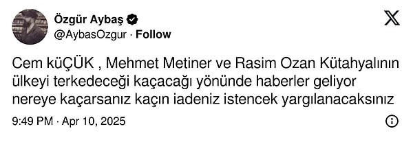 “Cem Küçük, Mehmet Metiner ve Rasim Ozan Kütahyalı’nın ülkeyi terkedeceği kaçacağı tarafında haberler geliyor nereye kaçarsanız kaçın iadeniz istencek yargılanacaksınız.”