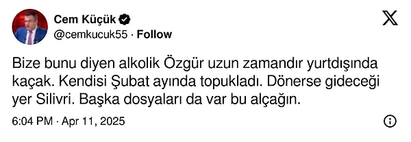 Türkiye Tekel Bayileri Platformu Başkanı Özgür Aybaş, X hesabından yaptığı paylaşımda çeşitli savlarda bulundu. Aybaş, Gazeteci Cem Küçük’ün yurt dışına kaçacağını ileri sürdü. Cem Küçük ise o teze ateş püskürdü.