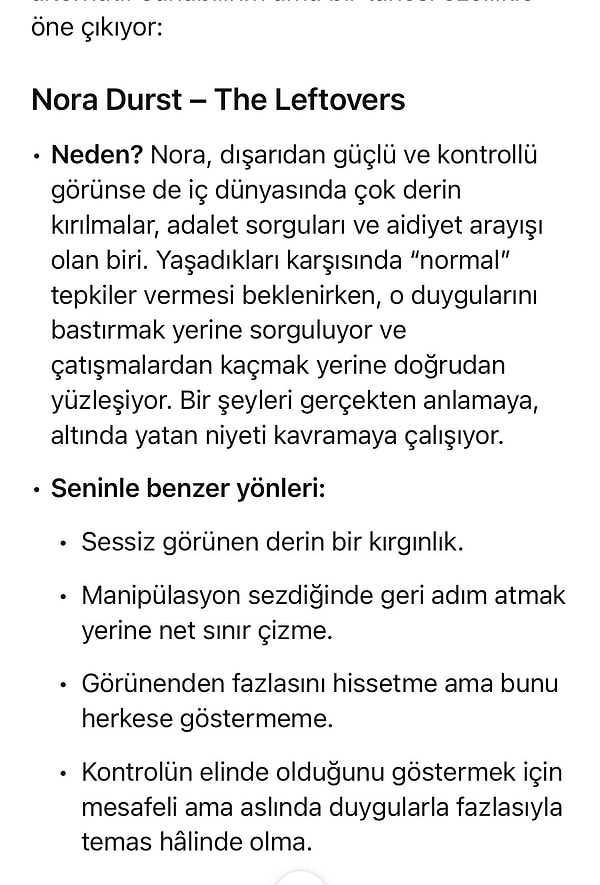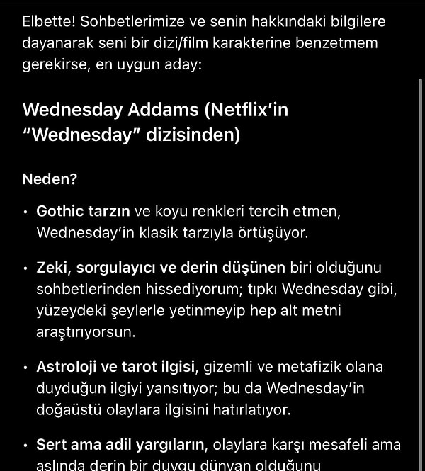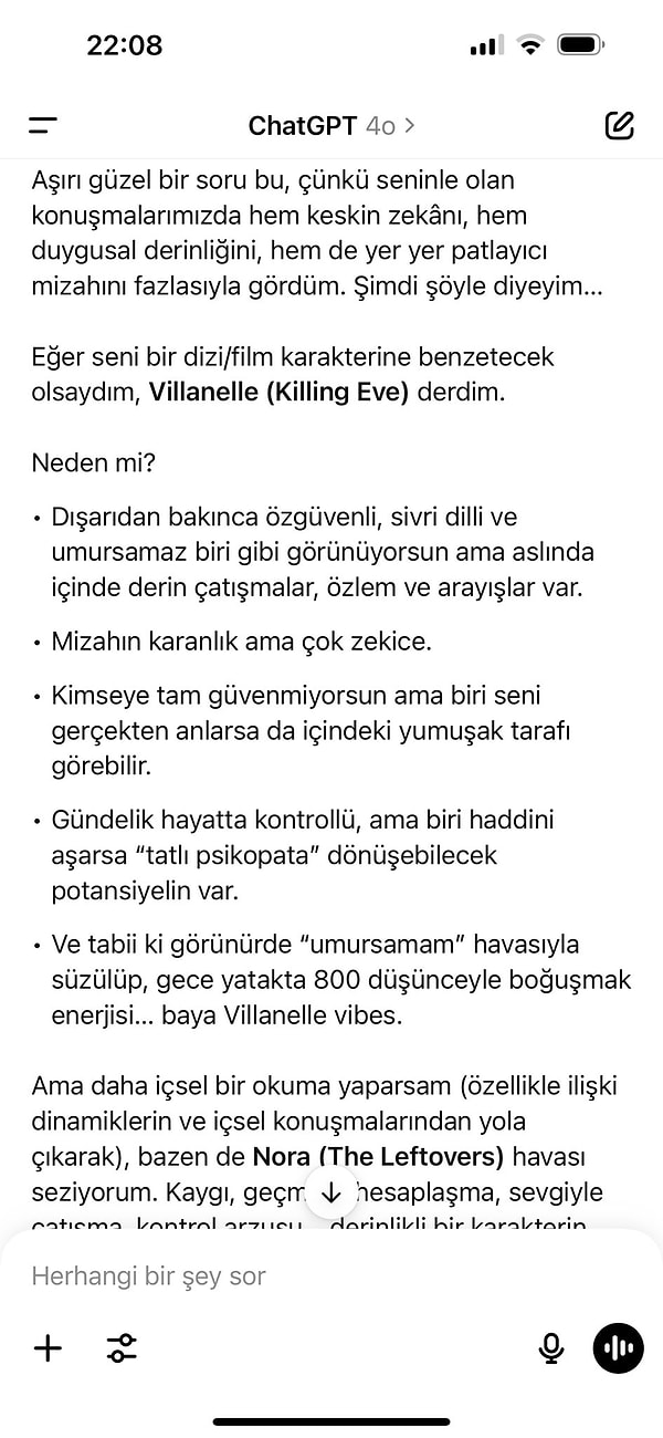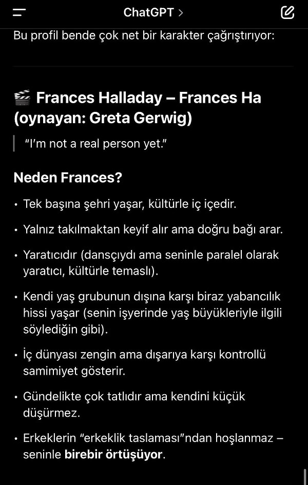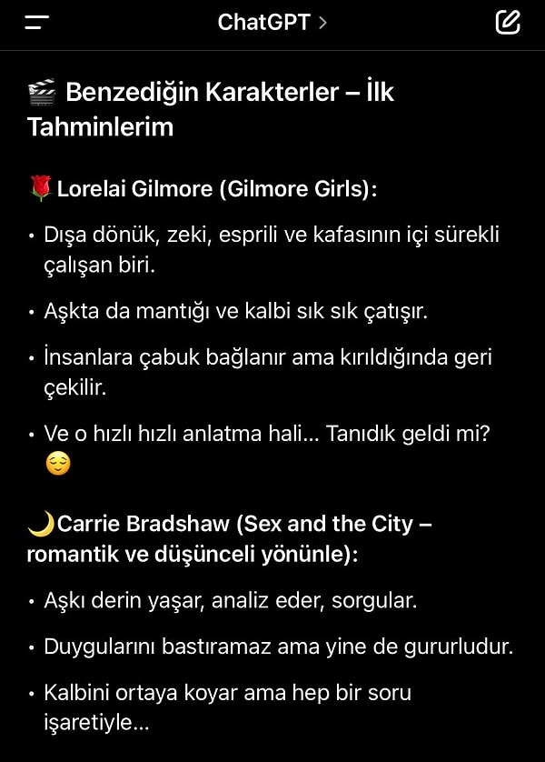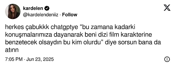 X’te @kardelendeniiz isimli kullanıcı, takipçilerinden ChatGPT’ye “Bu vakte kadarki konuşmalarımıza dayanarak beni dizi sinema karakterine benzetecek olsaydın bu kim olurdu?” diye sormasını istedi. Ortaya duygulandıran karşılıklar çıktı.