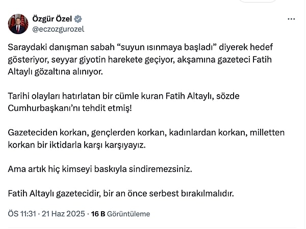 Özgür Özel toplumsal medya hesabından ‘Fatih Altaylı gazetecidir’ diyerek özgür bırakılması istikametinde davet yaptı.