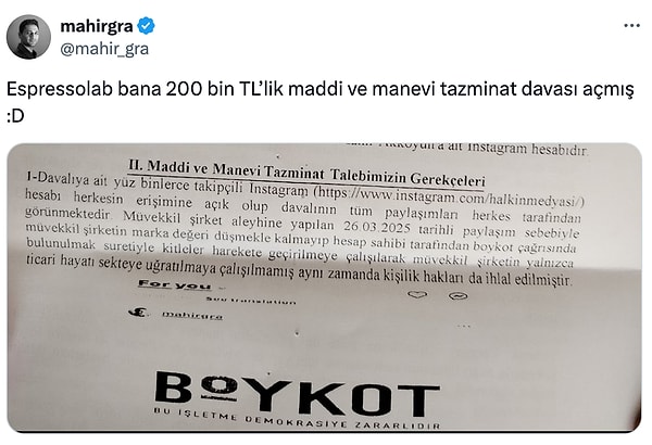 Ekrem İmamoğlu’nun diploma iptali ve sonrasına tutuklanmasıyla başlayan süreçte CHP’nin boykot listesine aldığı markaların başında gelen Espressolab, boykot daveti yaptığını argüman ettiği bireyler hakkında tazminat davası açmaya başladı. Bir toplumsal medya kullanıcısı dava tebligatını paylaşarak “Espressolab bana 200 bin TL’lik maddi ve manevi tazminat davası açmış :D” sözlerini kullandı.
