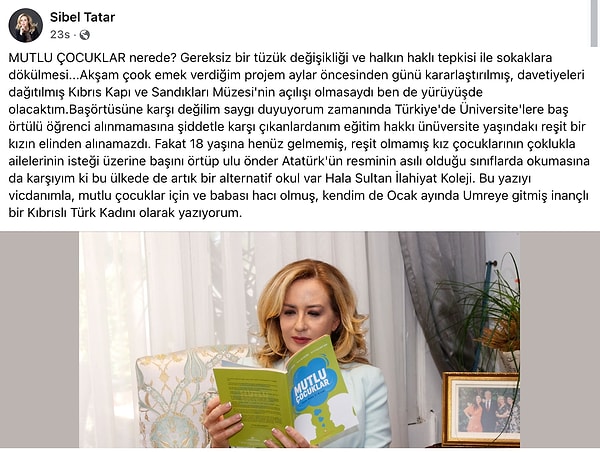 Sibel Tatar’ın “Başörtüsüne karşı değilim, hürmet duyuyorum. Lakin 18 yaşına şimdi gelmemiş, reşit olmamış kız çocuklarının, çoklukla ailelerinin isteği üzerine başını örtüp, ulu başkan Atatürk’ün fotoğrafının asılı olduğu sınıflarda okumasına da karşıyım” paylaşımı çok konuşuldu.