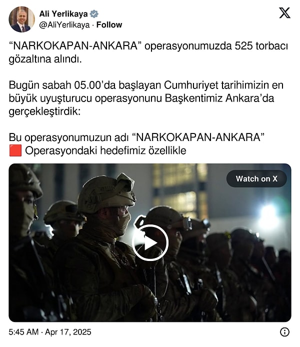İçişleri Bakanı Ali Yerlikaya, sosyal medya hesabından duyurduğu uyuşturucu operasyonunu, ‘Cumhuriyet tarihimizin en büyük uyuşturucu operasyonunu başkentimiz Ankara’da gerçekleştirdik’ diye duyurdu. Yerlikaya’nın paylaştığı bilgilere nazaran, 525 torbacı gözaltına alındı.