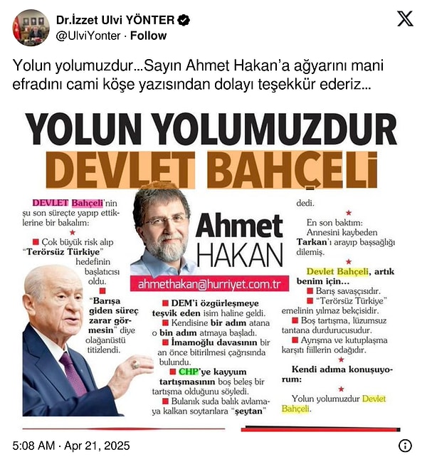 MHP Genel Lider Yardımcısı İzzet Ulvi Yönter, X hesabından Ahmet Hakan’a bu yazısından ötürü teşekkür etti.