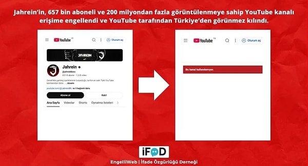 ‘Jahrein’ ismiyle bilinen yayıncı Ahmet Sonuç’un YouTube kanalı Türkiye’den erişime engellendi. Söz Özgürlüğü Derneği, kanalın YouTube tarafından Türkiye’den görünmez hale getirildiğini açıkladı.