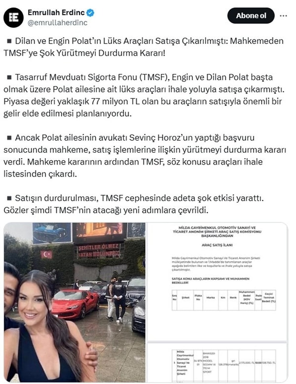 Emrullah Erdinç paylaşımda, ‘Dilan ve Engin Polat’ın Lüks Araçları Satışa Çıkarılmıştı: Mahkemeden TMSF’ye Şok Yürütmeyi Durdurma Kararı!