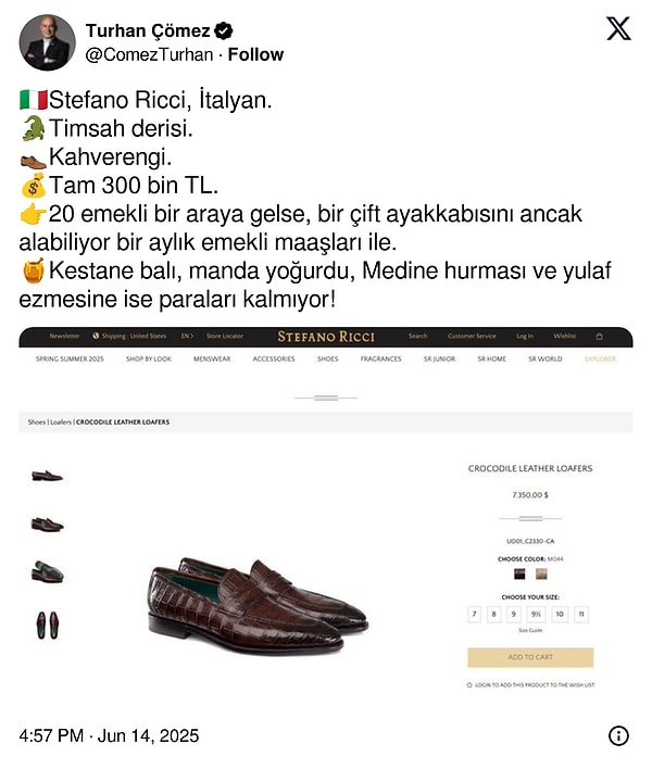 ‘Stefano Ricci, İtalyan.Timsah derisi.Kahverengi.Tam 300 bin TL.20 emekli bir ortaya gelse, bir çift ayakkabısını lakin alabiliyor bir aylık emekli maaşları ile.Kestane balı, manda yoğurdu, Medine hurması ve yulaf ezmesine ise paraları kalmıyor!‘