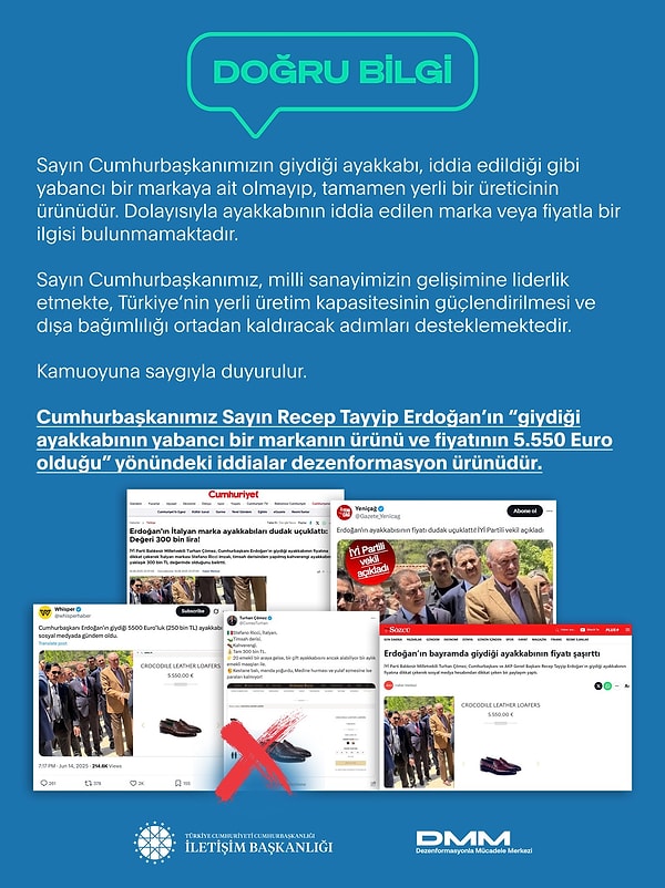 Dezenformasyonla Gayret Merkezi (DMM) Cumhurbaşkanı Erdoğan’ın ayakkabısının ismi geçen markadan olmadığını ve fiyatının da argüman edildiği üzere 5 bin 550 euro olmadığını açıkladı.