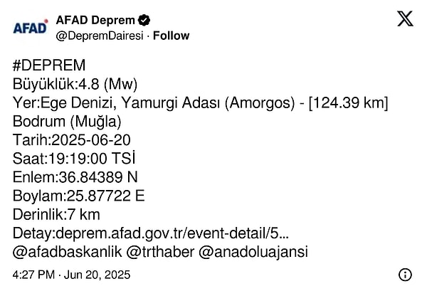 Deprem saat 19.19’da gerçekleşti. Ege Denizi’nde gerçekleşen zelzelenin derinliği 7 kilometre olarak açıklandı. Sarsıntının merkezi ise Ege Denizi, Yamurgi Adası (Amorgos) olurken Bodrum’a 124.39 kilometre uzaklıkta olduğu belirtildi.