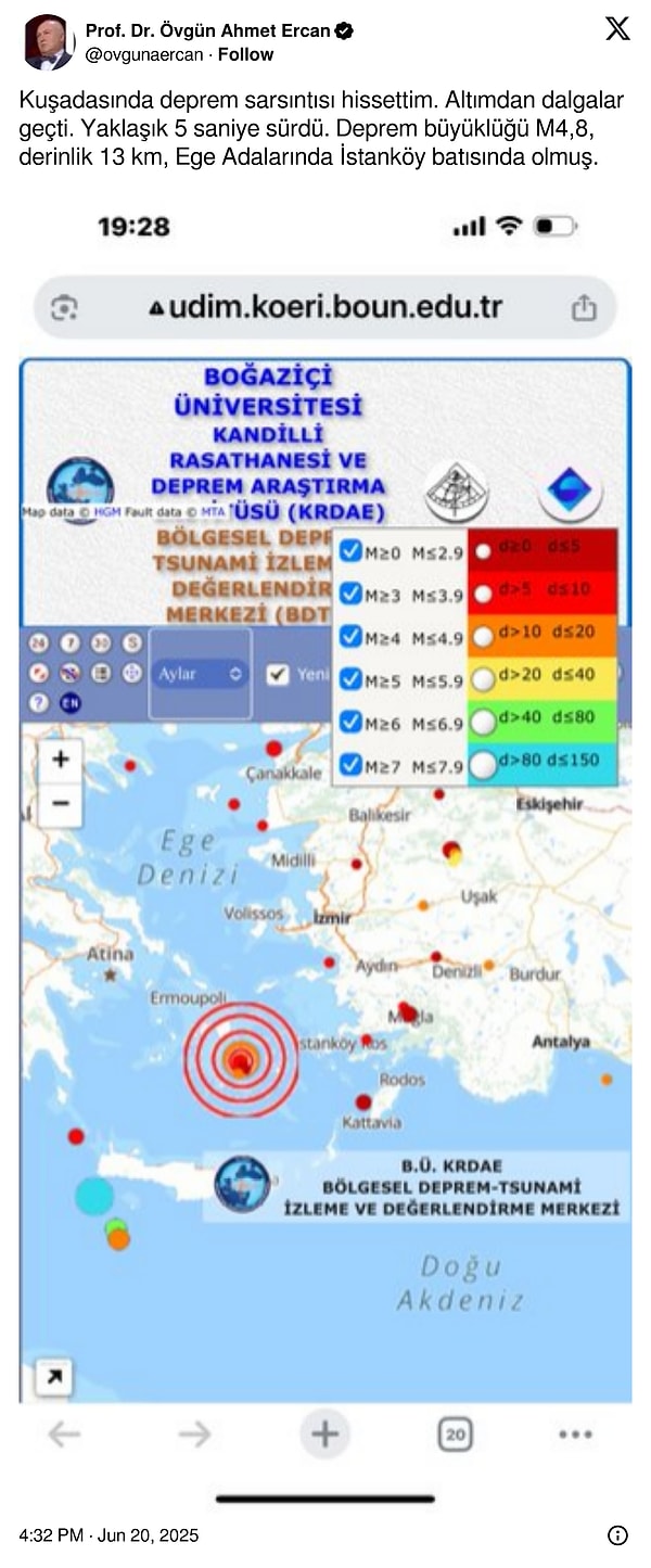 ‘Kuşadası’nda sarsıntı sarsıntısı hissettim. Altımdan dalgalar geçti. Yaklaşık 5 saniye sürdü. Zelzele büyüklüğü M4,8, derinlik 13 km, Ege Adalarında İstanköy batısında olmuş.’