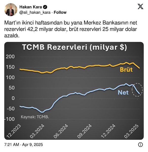 ‘Mart’ın ikinci haftasından bu yana Merkez Bankasının net rezervleri 42,2 milyar dolar, brüt rezervleri 25 milyar dolar azaldı.’