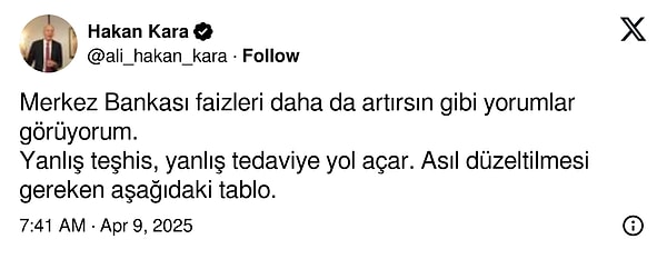 Hakan Kara ise ‘Merkez Bankası faizleri daha da artırsın üzere yorumlar görüyorum. Yanlış teşhis, yanlış tedaviye yol açar. Asıl düzeltilmesi gereken aşağıdaki tablo’ yorumunu yaptı.