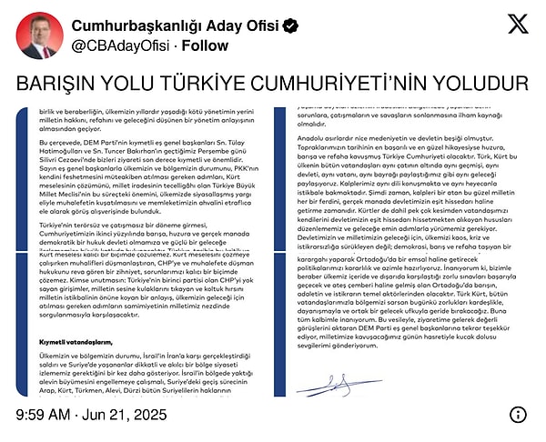DEM Parti heyeti Silivri Cezaevi’nde tutuklu bulunan İBB Başkanı Ekrem İmamoğlu’nu cezaevinde ziyaret etti. Ziyaretin akabinde bugün Ekrem İmamoğlu’ndan Terörsüz Türkiye paylaşımı geldi. İstanbul Büyükşehir Belediye Başkanı Ekrem İmamoğlu, resmi X hesabı ‘@CBAdayOfisi’nden Terörsüz Türkiye iletisi paylaştı. İmamoğlu, ‘Barışın yolu Türkiye Cumhuriyeti’nin yoludur’ dedi.