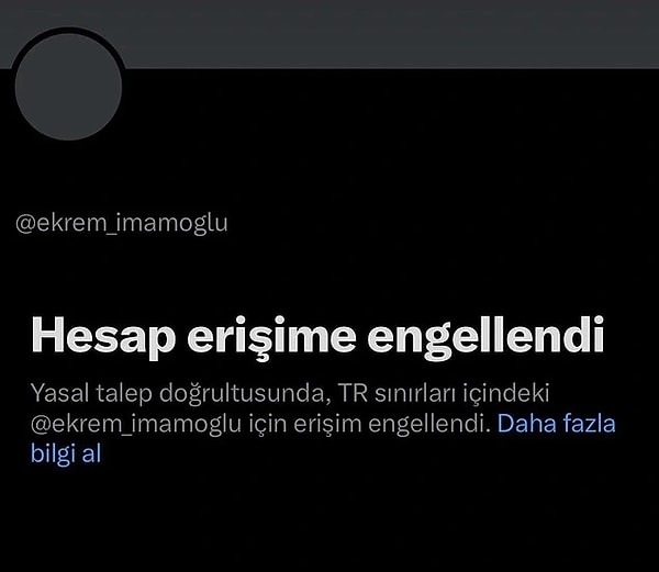 Silivri Cezaevi’nde tutuklu bulunan Ekrem İmamoğlu’nun X hesabı, 5651 sayılı Kanunun 8/A hususu kapsamında, ulusal güvenlik ve kamu sisteminin korunması gerekçesiyle erişime engellenmişti. İmamoğlu’na dayanak için profil fotoğrafını değiştiren Torbalı Belediye Başkanı Övünç Demir’in X hesabı askıya alındı.