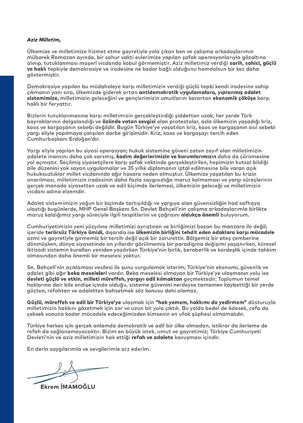Ekrem İmamoğlu son açıklamasında, “Aziz Milletim, ülkemize ve milletimize hizmet etme çabasıyla yola çıkan ben ve çalışma arkadaşlarımın mübarek Ramazan ayında, bir sahur vakti konutlarımıza yapılan şafak operasyonlarıyla gözaltına alınıp, tutuklanması müşteri vicdanda kabul görmemiştir. Aziz milletimiz verdiği sarih, gerçek, güçlü ve halkı reaksiyonlarla demokrasiye ve iradesine ne kadar bağlı olduğunu hamdolsun bir kere daha göstermiştir.’ dedi.