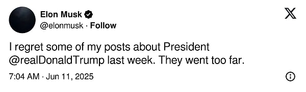 ABC kanalının telefonla ulaştığı Trump ise Musk hakkında ‘Aklını kaçırmış adamdan mı bahsediyorsun?’ cümlesini kurmuştu. İkili ortasındaki tansiyonun nasıl bir noktaya geleceği merakla beklenirken geri adım atan taraf Elon Musk oldu.