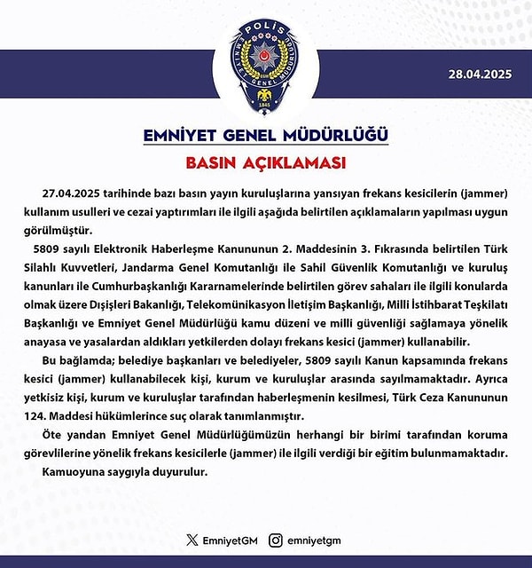 “27 Nisan 2025 tarihinde birtakım basın yayın kuruluşlarına, jammer kullanım yordamları ve cezai yaptırımları ile ilgili haberler yansıdığı belirtildi. Bunun üzerine hususla ilgili açıklama yapılmasının uygun görüldüğü belirtilerek, ‘5809 sayılı Elektronik Haberleşme Kanununun 2’nci Hususunun 3’üncü Fıkrasında belirtilen Türk Silahlı Kuvvetleri, Jandarma Genel Komutanlığı ile Kıyı Güvenlik Komutanlığı ve kuruluş kanunları ile Cumhurbaşkanlığı Kararnamelerinde belirtilen vazife alanları ile ilgili hususlarda olmak üzere Dışişleri Bakanlığı, Telekomünikasyon İletişim Başkanlığı, Ulusal İstihbarat Teşkilatı Başkanlığı ve Emniyet Genel Müdürlüğü kamu tertibi ve ulusal güvenliği sağlamaya yönelik anayasa ve maddelerden aldıkları yetkilerden ötürü frekans kesici (jammer) kullanabilir. Bu bağlamda; belediye liderleri ve belediyeler, 5809 sayılı Kanun kapsamında frekans kesici (jammer) kullanabilecek kişi, kurum ve kuruluşlar ortasında sayılmamaktadır. Ayrıyeten yetkisiz kişi, kurum ve kuruluşlar tarafından haberleşmenin kesilmesi, Türk Ceza Kanununun 124’üncü unsuru kararlarınca cürüm olarak tanımlanmıştır. Öte yandan Emniyet Genel Müdürlüğümüzün rastgele bir ünitesi tarafından muhafaza görevlilerine yönelik frekans kesiciler (jammer) ile ilgili verdiği bir eğitim bulunmamaktadır.”