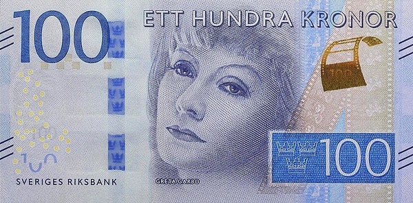 100 kronlukta Greta Garbo, yani efsanevi sinema oyuncusu.