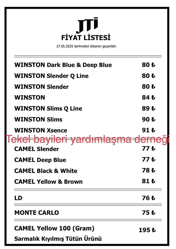 Tekel Bayileri Yardımlaşma Derneği Başkanı Erol Dündar, JTİ kümesindeki sigaralara artırım geldiğini duyurdu. Yapılan son artırımla birlikte JTİ kümesinde en ucuz sigara 75 lira oldu.
