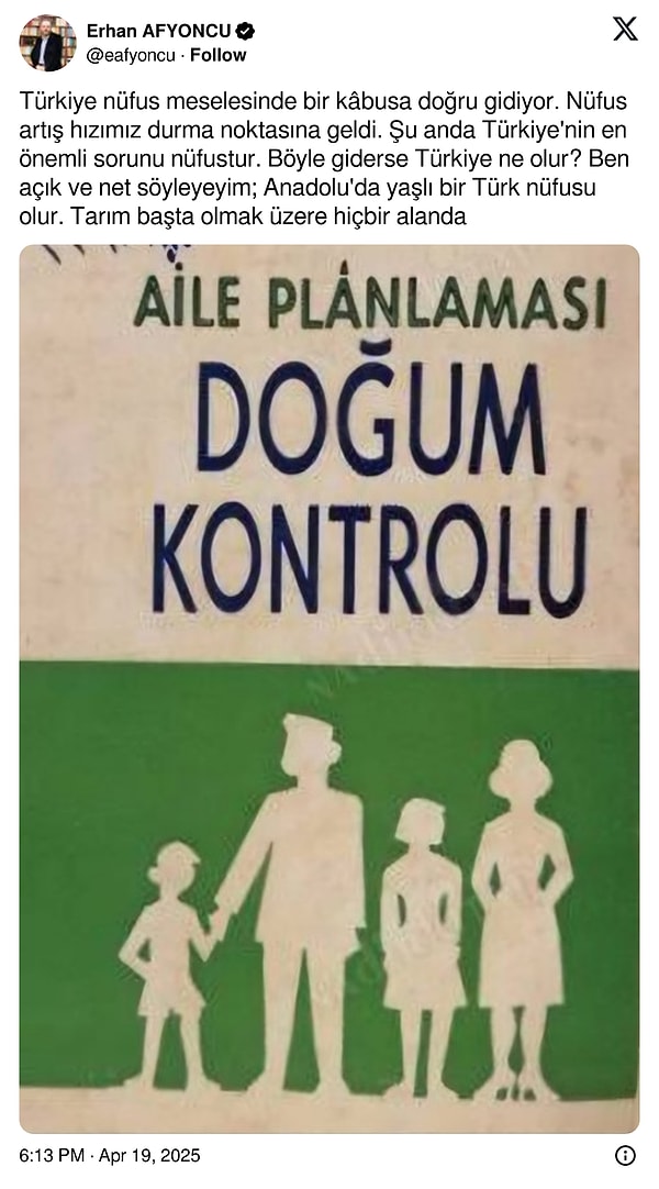 Cumhuriyet kurulduğu vakit Atatürk’ün en büyük hedeflerinden biri Türkiye’nin nüfusunu artırmaktı. 13 milyona düşmüştük. Çok çocuklu aile yapısı teşvik edildi. İzlenen siyaset sayesinde başarılı olundu. Türkiye 1960’lara kadar bu siyasetle geldi. 1965’te çok yanlış bir şey yapıldı. 1965’te kabul edilen 557 sayılı Nüfus Planlaması Hakkındaki Kanun, Türkiye’deki nüfus siyasetlerinde bir dönüm noktası oldu. Yıllarca nüfus planlaması yapıp çocuk sayısının azlığını teşvik ederek nüfus artış süratimizi düşürdük. Daima kendimizi mukayese ettiğimiz Avrupa ile bu mevzuda hiç karşılaştırma yapmadık ve Avrupa’nın durumuna gelebileceğimizi hiç hesaplamadık. Batı ülkelerinin nüfus yoğunluklarının bizim ülkemizden dört-beş misli gazla olmasına karşın Avrupalıların nüfus planlaması yapmayıp yeni doğumları teşvik ettiklerini görmezden geldik. Doğum denetimi sistemiyle Türk nüfusunu azalttılar. Bu tarihimizdeki en büyük yanlış işlerimizden biridir. Anadolu’nun batısında nüfus artış suratı düştü. Ege ve Marmara bölgelerinde çocuk sayısı azaldı. İç Anadolu ve Karadeniz doğurganlık suratını bir müddet koruma etti. Ancak somunda bu iki bölgemizde de doğurganlık süratimiz azaldı.